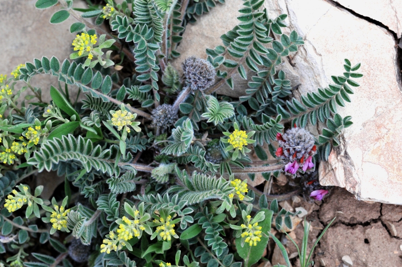 Comments: Mountain slope above Sulamaniya, Iraq. 23 March 2009. The astragalus has purple flowers and pinnate leaves, the yellow flowers are a crucifer.