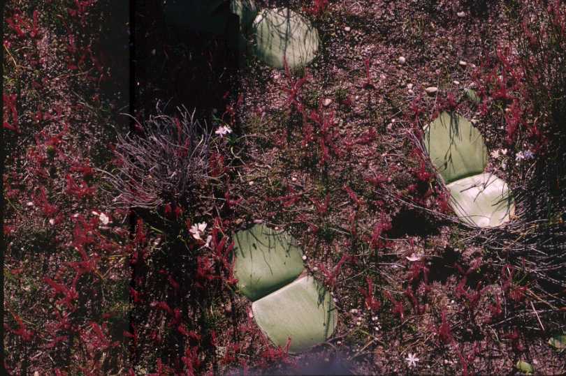 (large green leaves). Red plants are a species of Drosera. Giftberg, Near Vanrynsdorp, South Africa.
