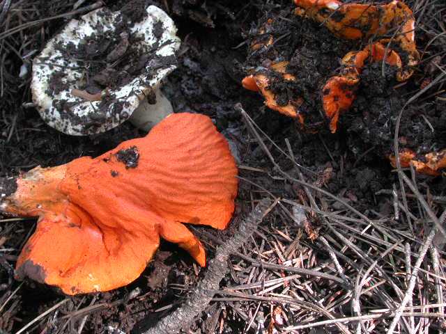 Comments: Lobster mushroom. The red color is the ascomycete parasitizing Russula brevipes. Near Mogollon, New Mexico. 18 August 2001.