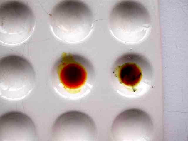 Comments: Melzers test of mushroom spores. On left is Amanita caesarea which is inamyloid; left is Amanita vaginata which is amyloid.