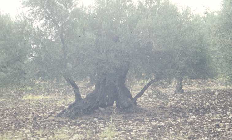 Olive. Old tree with shoots at the base.