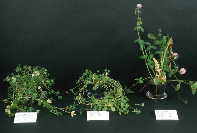 On Trifolium pratense (left), T. repens, control. Weed Research Organization photo.
