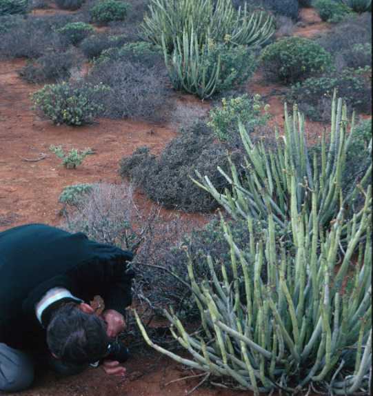 Comments: Piet Vorster, Stellenbosch University, photographing Hydnora triceps. Host is euphorbia dregeana. Near Port Nolloth, South Africa. September 1999.