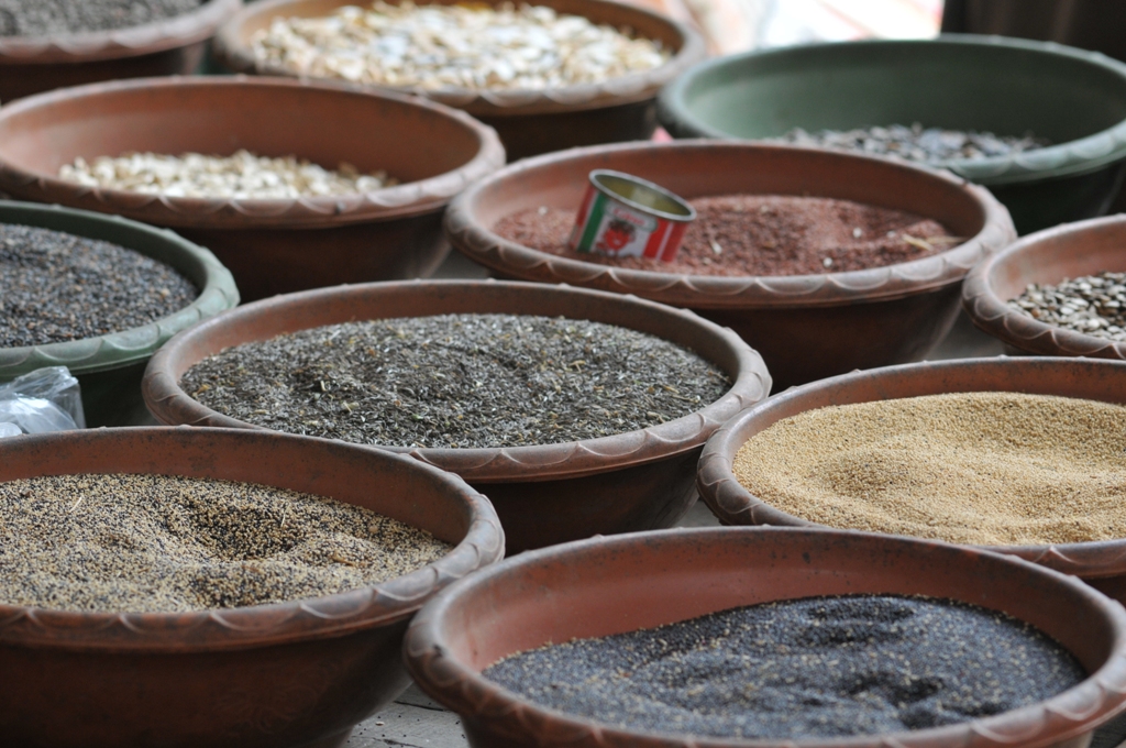 Market, Kano, Nigeria. 11 March 2009. The bottom three containers are all amaranthus seed.