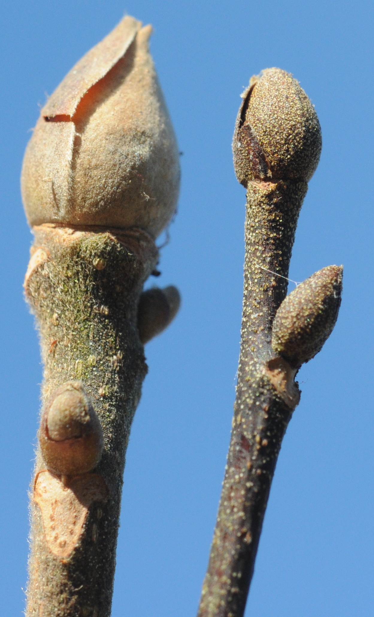Blackwater Ecologic Preserve 4 February 2010. Carya tomentosa, left; C. pallida right.