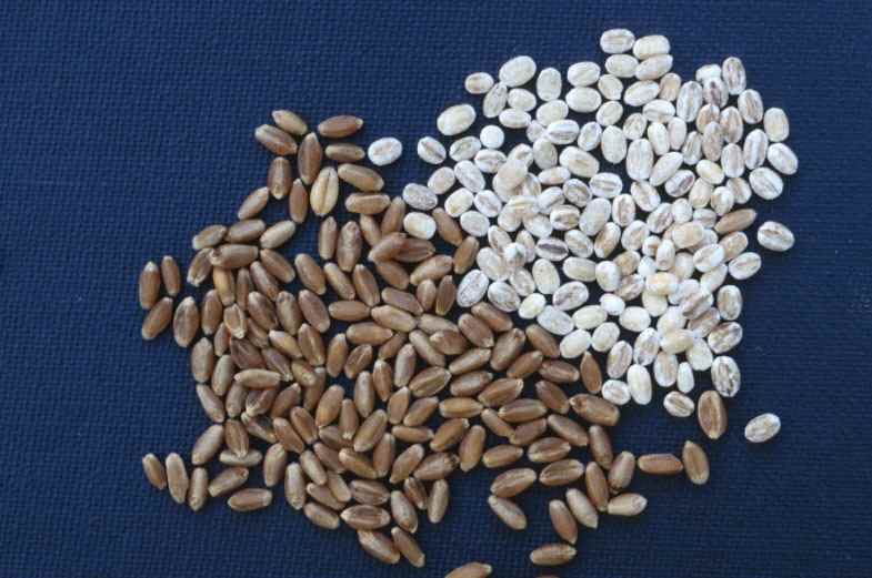 (barley) pearled (white, outer coat removed) and whole grains (brown)